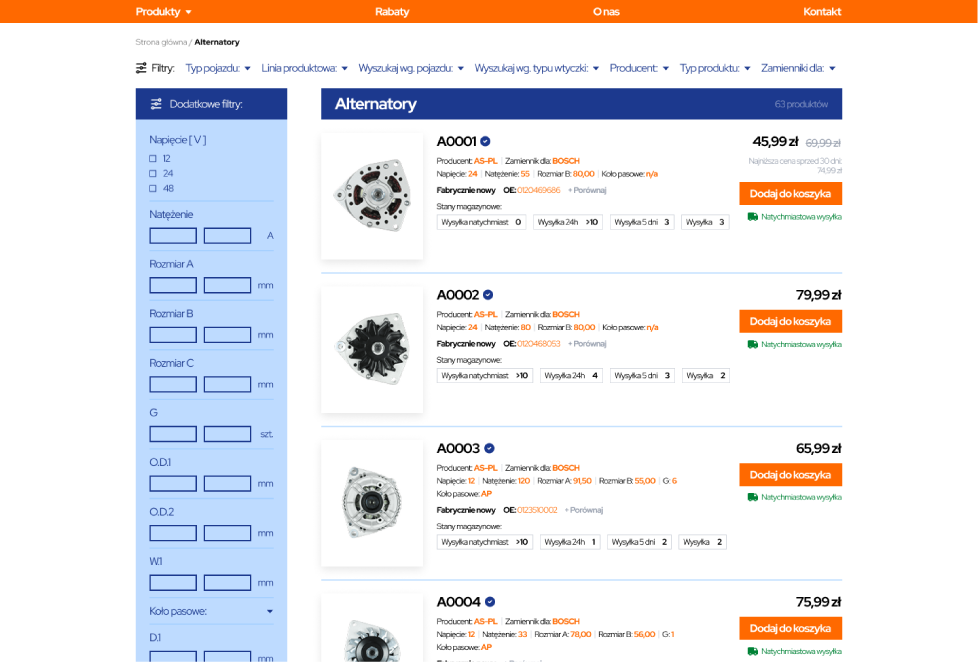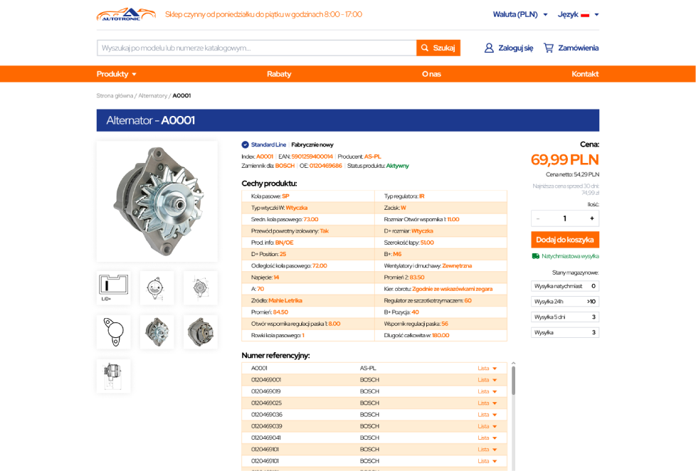 - Zaawansowane drzewo kategorii – intuicyjny podział na alternatory, rozruszniki i podzespoły, przyspieszający ścieżkę zakupową.