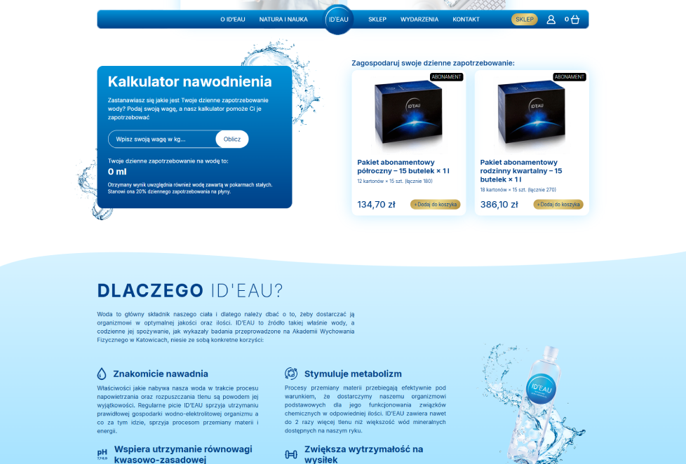 Dla Id’eau stworzyliśmy sklep internetowy, który łączy elegancki wygląd z nowoczesnymi technologiami. Klienci mogą zamawiać wodę premium w cyklicznych dostawach, korzystać z kalkulatora nawodnienia i płacić online w kilka kliknięć.