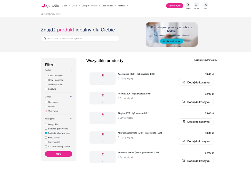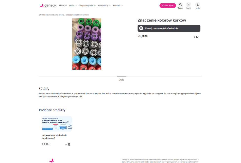 Laboratorium Genetix to nowoczesna platforma e-commerce stworzona przez Gorilla Commerce, która łączy sprzedaż badań genetycznych, kursów i materiałów edukacyjnych w jednym, intuicyjnym systemie.