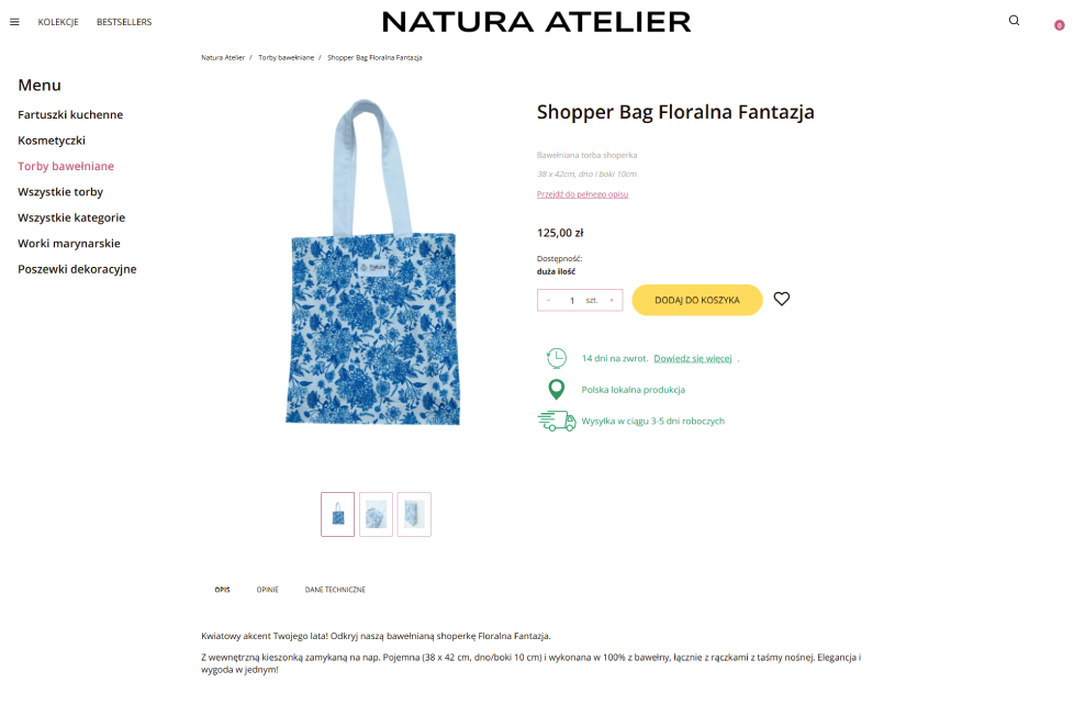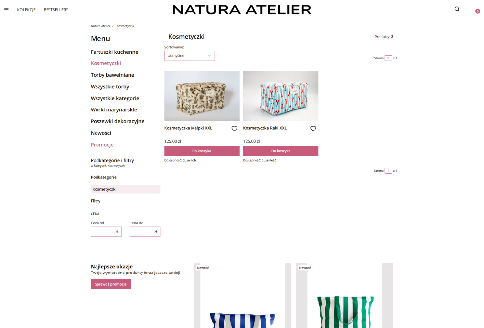 - Optymalna struktura kategorii: Produkty podzielone zostały na czytelne sekcje (np. kosmetyczki, torby, fartuszki), co ułatwia ich przeglądanie.